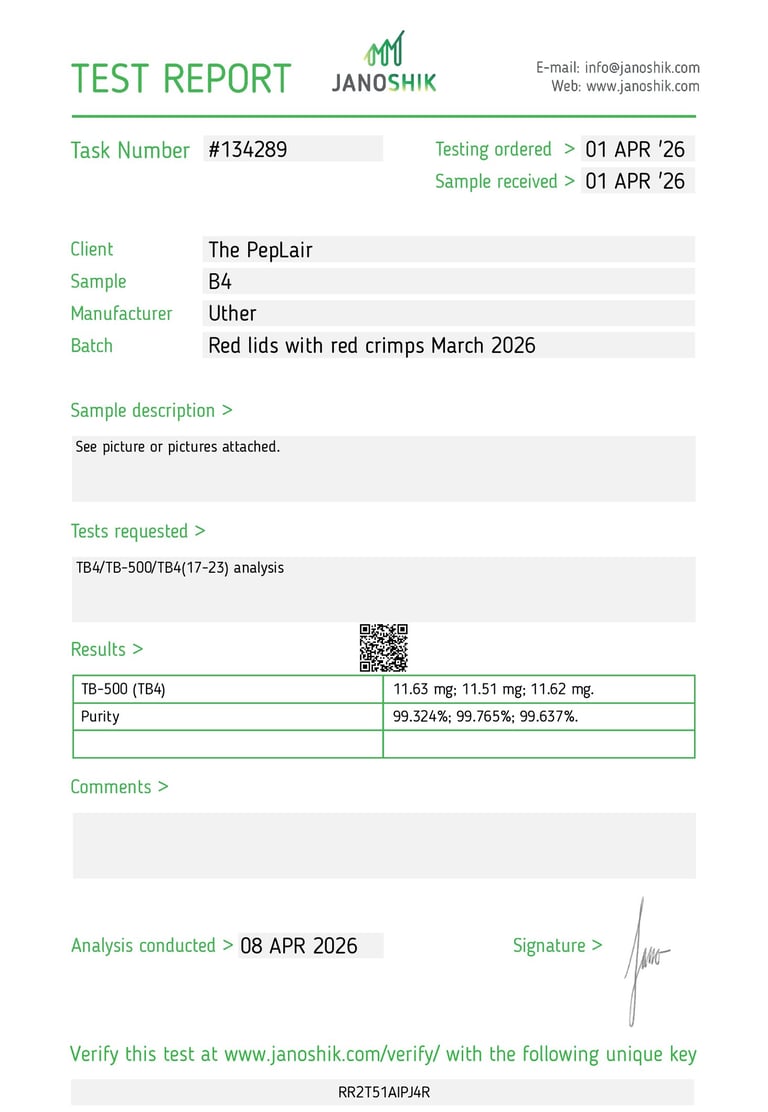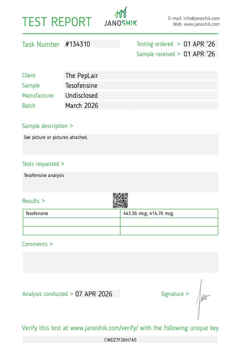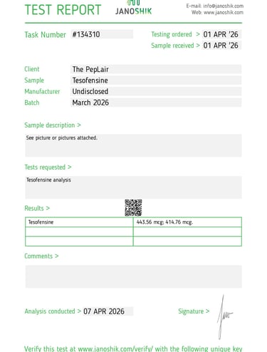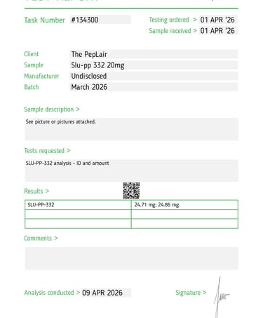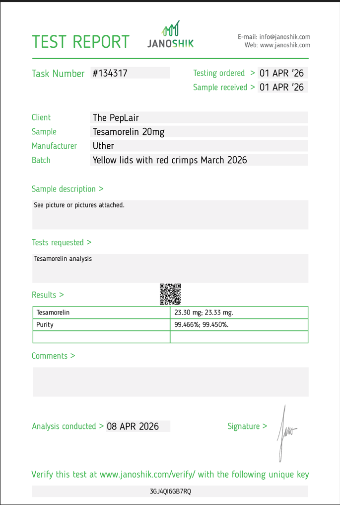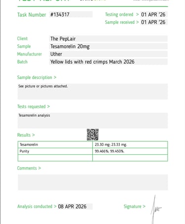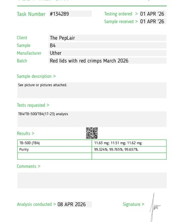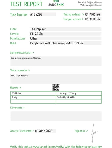 All of our COA's are either from batches tested by The PepLair (you may see Javik's Junction as those are from before out current name), our partners such as Grey Axis Research or Mrs. Goodlife Goodies, or from the vendor themselves such as Uther.